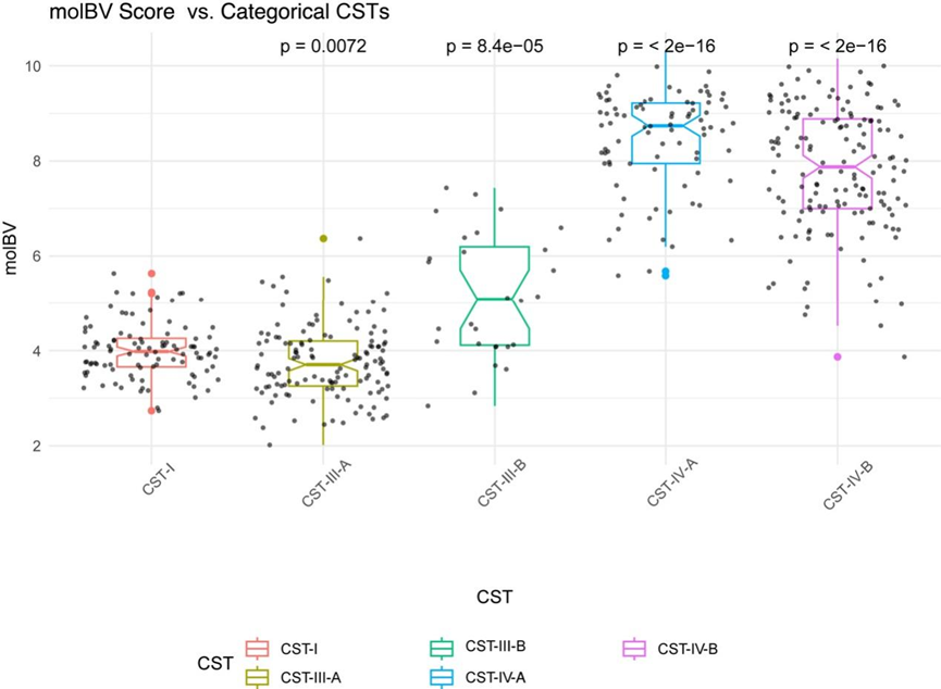 图S2. 宫颈阴道 CST 类别中的 molBV评分分布。