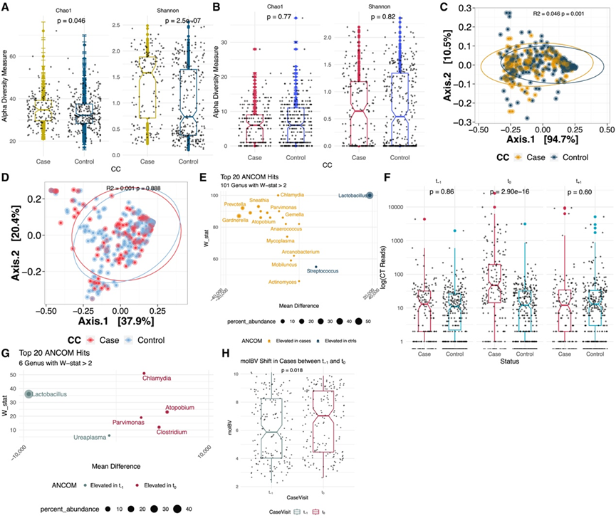 (A-B) 分别为 t0时的细菌和真菌 α 多样性。 (C-D) 分别在 t0时对细菌和真菌进行主坐标分析 (PCoA)。(E) ANCOM 分析结果,确定了与 t0时的 CT 病例状态相关的差异丰富属。(F) 在三次研究访问中,沙眼衣原体16SV4 rRNA总回收率。(G) 病例中由于 CT 采集而发生改变的属。