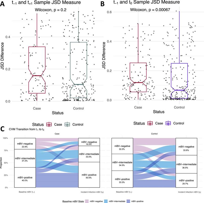 他们评估了 CT 抗生素治疗后(t+1)的 CVM 动态,主要使用阿奇霉素或强力霉素。使用 ANCOM进行细菌或真菌 α 和 β 多样性分析或特定物种分析时,治疗后 CT 病例的 CVM 与此时(t +1)的对照组相比没有明显差异(图 S5)。这表明使用这些措施可以在组级别上解决类似对照的状态。然而,多变量模型表明,在病例中,mBV 中间组与对照组相比升高。在治疗后访视(t +1)对 CST 的类似分析表明,CST-III-A 和 CST-IV-A 仍然升高。此外,在两种模型中,与对照组相比,接受 CT 治疗的女性(即 t +1时的 CT 病例)的 HR-HPV 率仍然显著升高。ANCOM 未发现病例组在 t −1 vs. t +1时。病例组 CT 治疗前后 CVM 的组成变化与对照组在此期间(约 1 年)的 CVM 波动相似(图 S6 A)。综上所述,这些数据表明病例组在治疗后恢复到与 CT 感染前相似的 CVM 组成。考虑到 CT 对 CVM 的扰动[以 t−1和 t 0之间的 Jensen-Shannon 散度 (JSD) 差异来衡量],与对照组 CVM 在类似的 6 个月期间的波动相比(图 S6 B),这种逆转尤其值得注意。值得注意的是,在对照组中,6 个月(即 t −1与 t 0)和 12 个月(即 t −1与 t +1)的 CVM 比较存在显著差异。这表明,即使在没有 CT 感染等强烈干扰的情况下,时间也会对 CVM 组成产生持续影响。事实上,CVM 从 t −1到 t 0 的转变取决于 t −1时的 mBV 状态访问。对照组在此 6 个月的时间窗口内表现出 mBV 状态之间的平衡转变,而病例组则倾向于转变为 mBV 阳性状态(即,在 t 0时处于 mBV 阳性状态的可能性取决于基线 t −1 CVM:mBV 阳性时较大,mBV 中等时较弱,mBV 阴性时最弱(但仍强于对照组)(图 S6 C)。