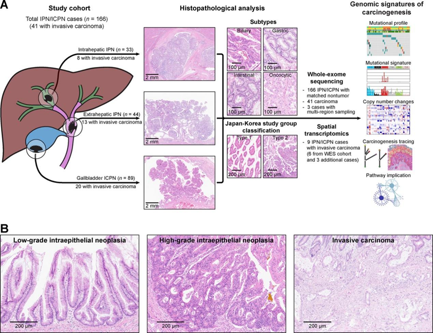 (A) 研究队列和实验工作流程的总结。(B) 低级别(左)、高级别(中)IPN/ICPN 和浸润性癌(右)的代表性显微镜图像。