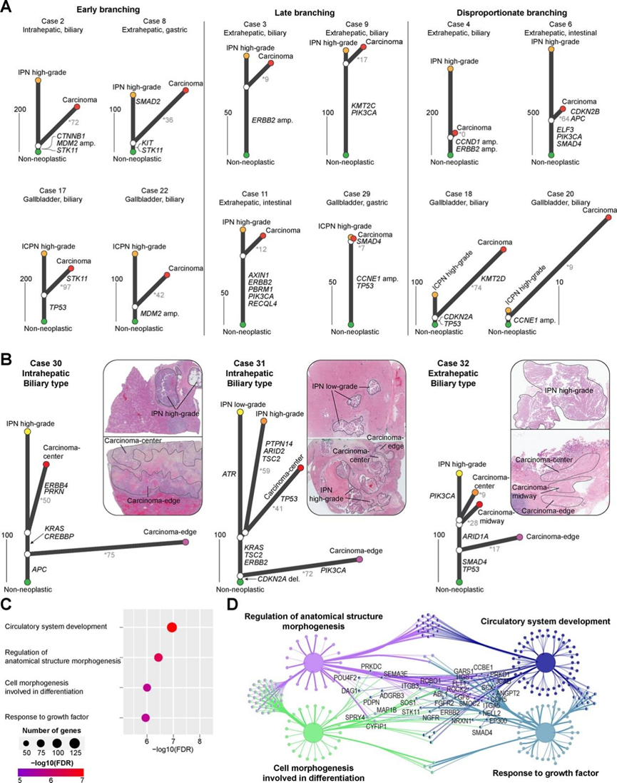 (A) IPN/ICPN 衍生癌病例的系统发育树。(B) 三个多区域测序病例的系统发育树。(C)GO分析。(D) 具有富集突变的通路网络。