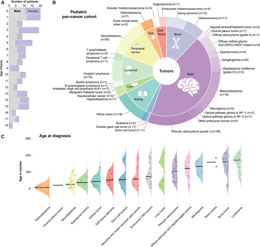 (A) 按诊断年龄划分的男孩和女孩的数量。(B) ISAC 研究中纳入的 n = 191 名儿童中 34 种肿瘤类型的分布。(C) 以中位数条显示每种肿瘤类型的诊断年龄分布。