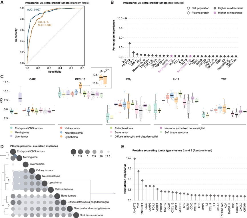 (A) 基于质谱流式细胞测量的细胞群体频率和血浆蛋白测量 的双交叉验证随机森林分类器区分颅内和颅外肿瘤 。(B) 随机森林分类器中留一法分析颅内和颅外肿瘤的特征重要性。(C) 选定的血浆蛋白在肝肿瘤(碳酸酐酶 IX [CAIX])和淋巴瘤(CXC 基序趋化因子配体 13 [CXCL13])中表现出肿瘤特异性丰度。(D) 11 种肿瘤类型(n = 135 个血浆样本)血浆蛋白谱之间的成对距离(欧几里德距离)显示具有相似蛋白谱的三类肿瘤类型。(E) 双重交叉验证随机森林分类器将中的肿瘤类型聚类#2和#3分开,显示聚类2肿瘤的血浆样本中最高区分性的血浆蛋白均较高。