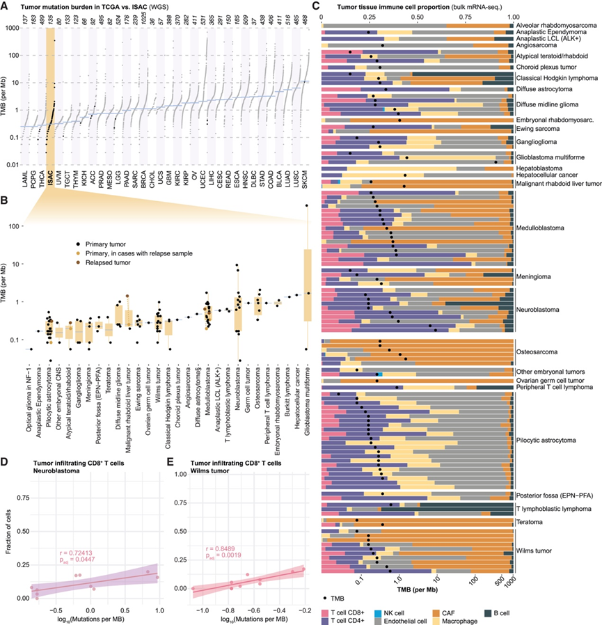 (A) 全基因组测序中每兆碱基 DNA 的肿瘤突变负担 (TMB)。(B)ISAC 样本的 TMB 按肿瘤类型划分,基线样本或复发样本以不同的颜色划分,并连接到相应的原发性肿瘤样本。(C) 所示肿瘤样本的肿瘤组织mRNA 测序以及排除肿瘤细胞后估计的免疫细胞和基质细胞比例。(D-E) CD8+ T 细胞比例与神经母细胞瘤和Wilms 肿瘤组织样本中的 TMB 相关。