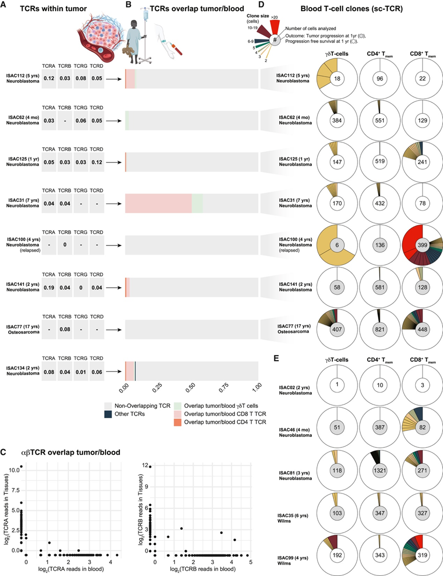 遇到同源抗原并离开肿瘤引流淋巴结的肿瘤特异性 T 细胞将重新循环到血流中,可识别为血液中克隆扩增的 T 细胞。这种扩增的程度与肿瘤内的局部扩增相关。为了分析患有实体瘤的儿童的 T 细胞反应,他们首先使用 TRUST4(使用剪接转录本 4 进行肿瘤识别)算法在诊断时提取的肿瘤组织中的mRNA测序中寻找扩增的 T 细胞受体 (TCR) 基因(图 5 A)。鉴于神经母细胞瘤中 T 细胞浸润丰富,他们重点研究了七个神经母细胞瘤肿瘤和一个具有大量 mRNA 测序数据的骨肉瘤肿瘤,但发现 TCRA、TCRB、TCRG 和 TCRD 基因的指数非常低,表明在这些肿瘤中诊断时 T 细胞克隆扩增很少见(图 5 A)。他们还从这些患者的血液中分选了记忆 αβT 细胞和 γδT 细胞,并进行了单细胞 TCR(VDJ)测序和 mRNA 测序。他们检测了肿瘤和血液之间重叠的 TCR 基因,但发现重叠非常有限,患者 ISAC031(神经母细胞瘤)的 TCRA 基因除外,其中 30% 的 TCRA 基因在肿瘤和血液之间重叠(图 5B)。当比较来自n = 42 名患者的配对血液和肿瘤样本的更深层次的 mRNA 测序数据时,TCRA 和 TCRB 基因(图 5C)或 TCRG 和 TCRD 基因几乎发生重叠。用于血液 T 细胞的单细胞 TCR 测序方法可以精确分析具有配对受体链的克隆扩增,但每个样本只能对有限数量的 T 细胞进行测序。虽然儿科患者在诊断时表现出很少的克隆扩增(图 5 C),但在复发时(ISAC100)纳入的一名儿童在取样前接受过化疗,其 CD8 + T 细胞大量克隆扩增,表明可能存在治疗效果(图 5 D)。复发肿瘤内的 TCR 基因没有重叠,肿瘤本身的扩增也很少(图 5 A-5B)。当比较 1 年无进展生存期的儿童和未无进展生存期的儿童时,基线克隆扩增程度没有明显差异(图 5 D),在另外 5 名没有重叠肿瘤数据的儿童血液中也观察到了类似的结果(图 5E)。