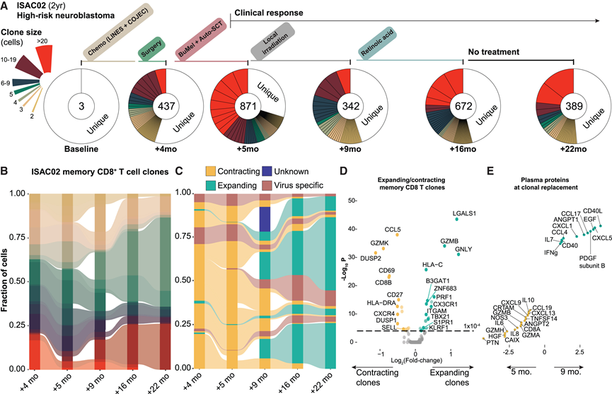 (A) 使用 BD Rhapsody 从基线(治疗前)和指定干预后收集的六个纵向样本中对记忆性 CD8+ T 细胞 (CD45RA −) 进行分选和 scVDJ 和 mRNA 测序。(B) 与(A)中相同的儿童在治疗过程中的克隆扩张和收缩,每个流代表一个克隆。(C) 自体干细胞移植(ASCT)和高剂量治疗后5至9个月治疗期间的克隆替换。(D) 自体干细胞移植(ASCT)和高剂量治疗后5至9个月治疗期间的克隆替换。(E) 诊断后 5-9 个月断点处发生的导致缓解的克隆替换的血浆蛋白相关性。