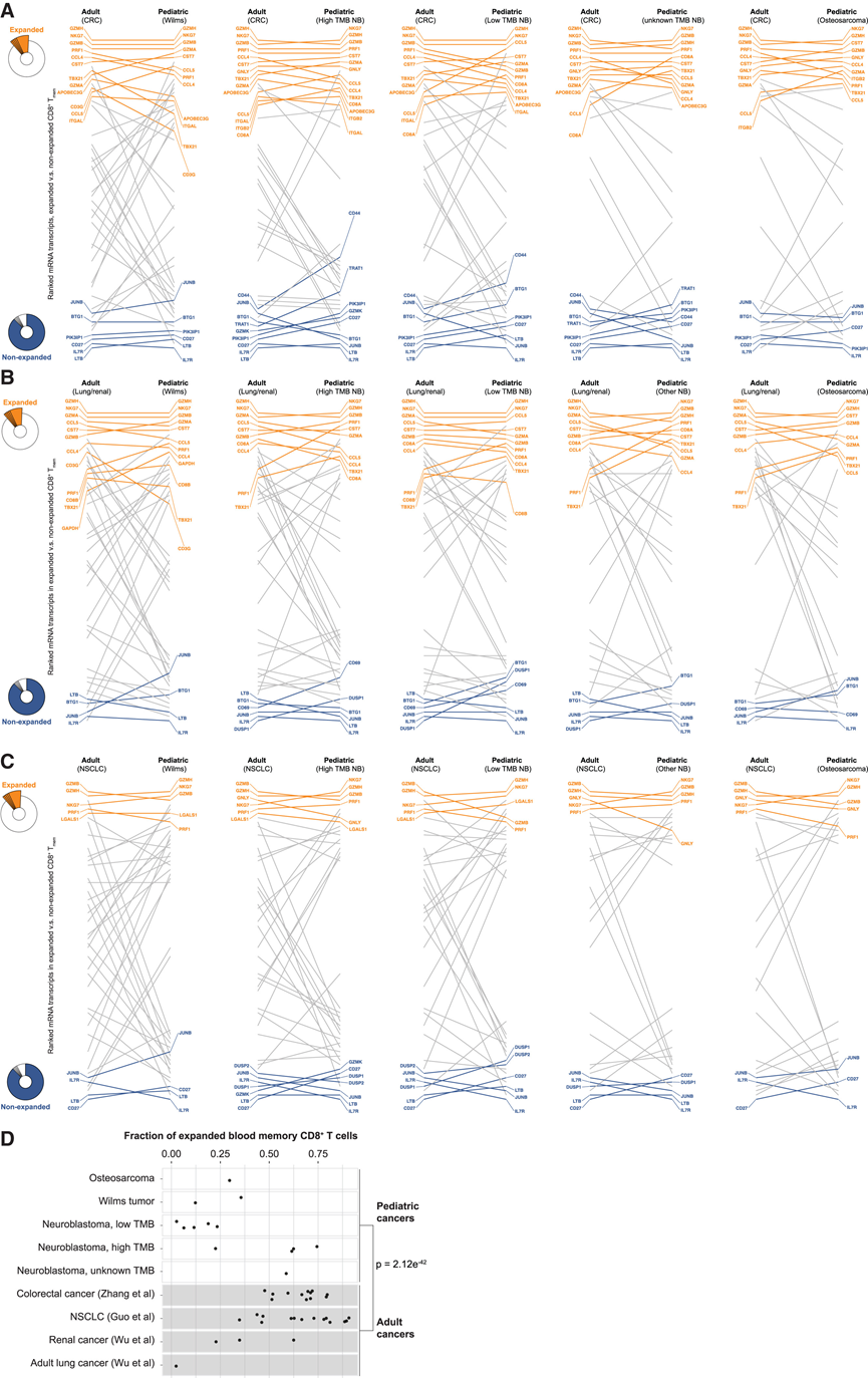 免疫检查点抑制剂为患有各种癌症的成年人带来了重要进展,但在患有实体瘤的儿童中报告的成功率有限。他们将ISAC 队列中儿童的克隆扩增记忆 CD8+ T 细胞反应与其他人先前发表的成年患者的反应进行了比较。通过靶向单细胞 mRNA 测序分析了四名患有低TMB 的神经母细胞瘤儿童、三名患有高 TMB 神经母细胞瘤的儿童、一名患有未知突变率神经母细胞瘤的儿童、两名患有 Wilms 肿瘤的儿童和一名患有骨肉瘤的儿童的 T 细胞 mRNA 转录本。对于每个数据集,他们根据转录本在克隆扩增的记忆 CD8 + T 细胞中的富集情况对其进行排序。他们将这些来自儿童 CD8 T 细胞的排序列表与来自成年结直肠癌患者(CRC)血液样本的可比列表进行了比较(图 7 A)。在儿童和成人癌症患者中,克隆扩增的 CD8 + T 细胞中最富集的转录本是细胞毒性标志物(NKG7、GZMH、GZMB、IFNG和PRF1)(图 7 A)。进一步将儿童样本与肾癌或肺癌(图 7 B)或非小细胞肺癌 (NSCLC)(图 7 C)成人的 CD8 + T 细胞进行比较,发现在各种肿瘤类型的儿童和成人 CD8 + T 细胞中克隆扩增和非扩增细胞中富集转录本的模式相似。这些结果表明,克隆扩增的 CD8 + T 细胞在成人和儿童以及多种类型的肿瘤中受到类似的转录调控。他们没有发现任何证据表明存在儿科特异性检查点分子或其他调节途径,可以解释:与患有实体瘤的成年人相比,检查点抑制对儿童的疗效较低。