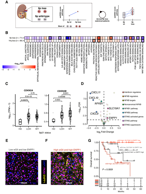 (A) 在没有患者特异性因素混杂效应的情况下分析亚克隆拷贝数改变的转录关联的程序说明。(B) 50个不同标志特征的转录变化与ccRCC亚克隆9p和14q缺失的关联。(C) CDKN2A 和CDKN2B 的表达。(D) cGAS-STING通路上下游基因的差异表达分析。(E-F) 具有代表性的TRACERx肾肿瘤样本MIF图像。(G) 生存分析。