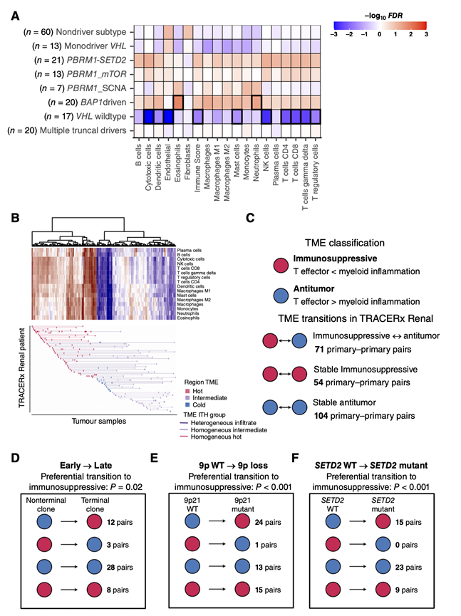 (A) TME细胞丰度与肿瘤进化轨迹的关系。(B) 213个TRACERx肾肿瘤样本的免疫浸润模式聚类。(C) 使用T效应因子和髓系炎症z评分之间的相对差异对TME进行二分类。(D-F) 早期→晚期原发-原发对(早期由含有非末端克隆的样本代表,晚期由含有末端克隆的样本代表),SETD2 WT→SETD2-突变原发-原发对,9p WT→9p缺失原发-原发对,向免疫抑制性TME的方向富集。