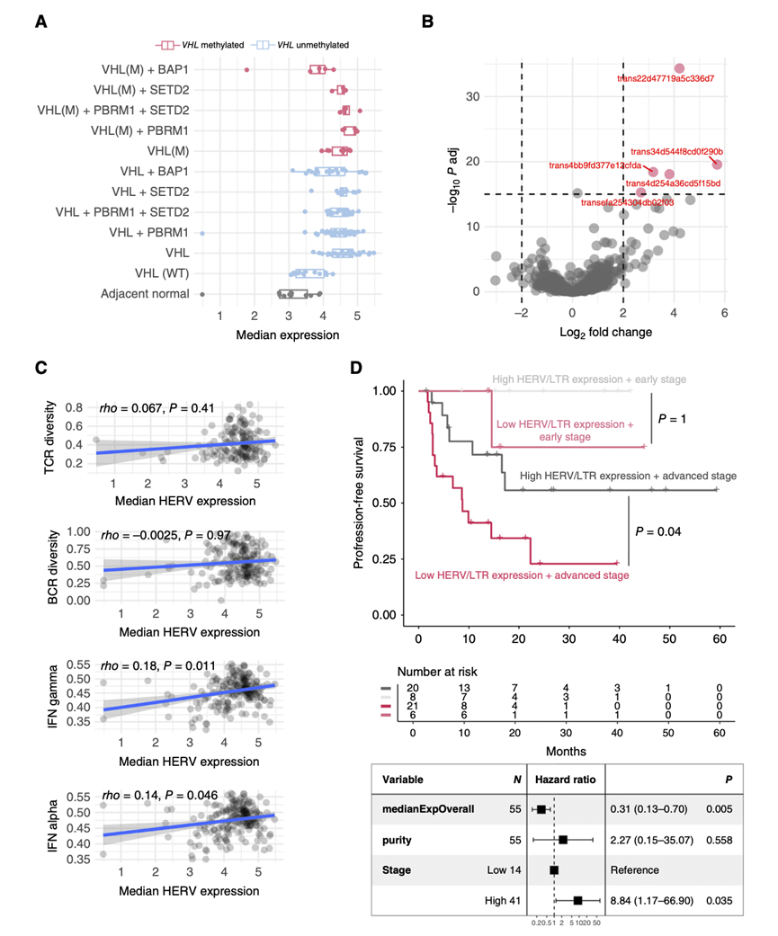 (A) 在TRACERx肾(n = 243个样本)中615个转录本重叠注释逆转录元件的中位表达分布。(B) VHL功能缺失(甲基化或突变)的肿瘤样本与VHL野生型肿瘤样本或邻近正常组织的差异表达分析。(C) TCR多样性、BCR多样性、IFN α和gamma ssGSEA评分(每个患者的中位数)与中位HERV表达的相关性(从上到下)。(D)生存分析。