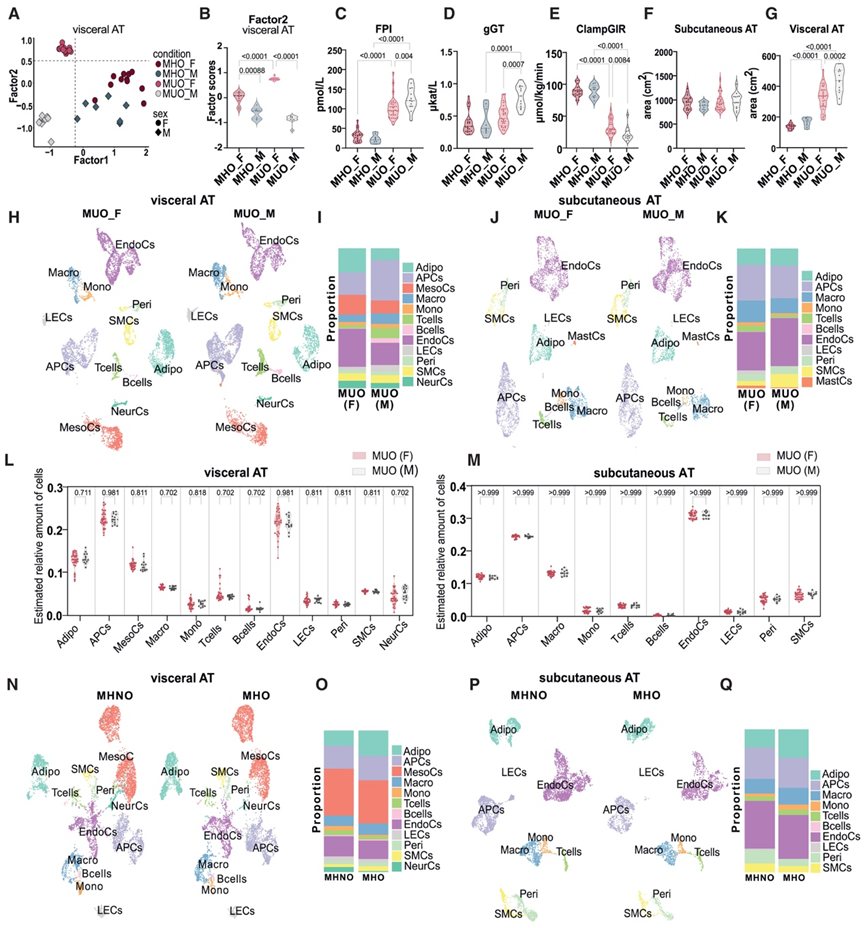 (A) 多细胞因子分析。(B) 小提琴图显示患有 MHO 和 MUO 的男性(_M)和女性(_F)个体的内脏 AT 潜在因子 2 评分分布。(C-G) 空腹血浆胰岛素 (FPI)、葡萄糖耐量 (gGT)、正常血糖、高胰岛素钳制葡萄糖输注率 (ClampGIR)、皮下和内脏 AT 面积分布。(H,J) UMAP 代表 MUO 患者的内脏 AT 和皮下 AT。(I,K) 条形图显示 MUO 患者的内脏 AT 和皮下 AT 中相对细胞类型比例。(L-M) 小提琴图显示了根据 MUO 患者的内脏 AT和皮下 AT的相对细胞类型比例。(N-P)UMAP可视化。(O-Q) 条形图显示 MHNO 和 MHO 在内脏 AT 和皮下 AT 中的相对细胞类型比例。