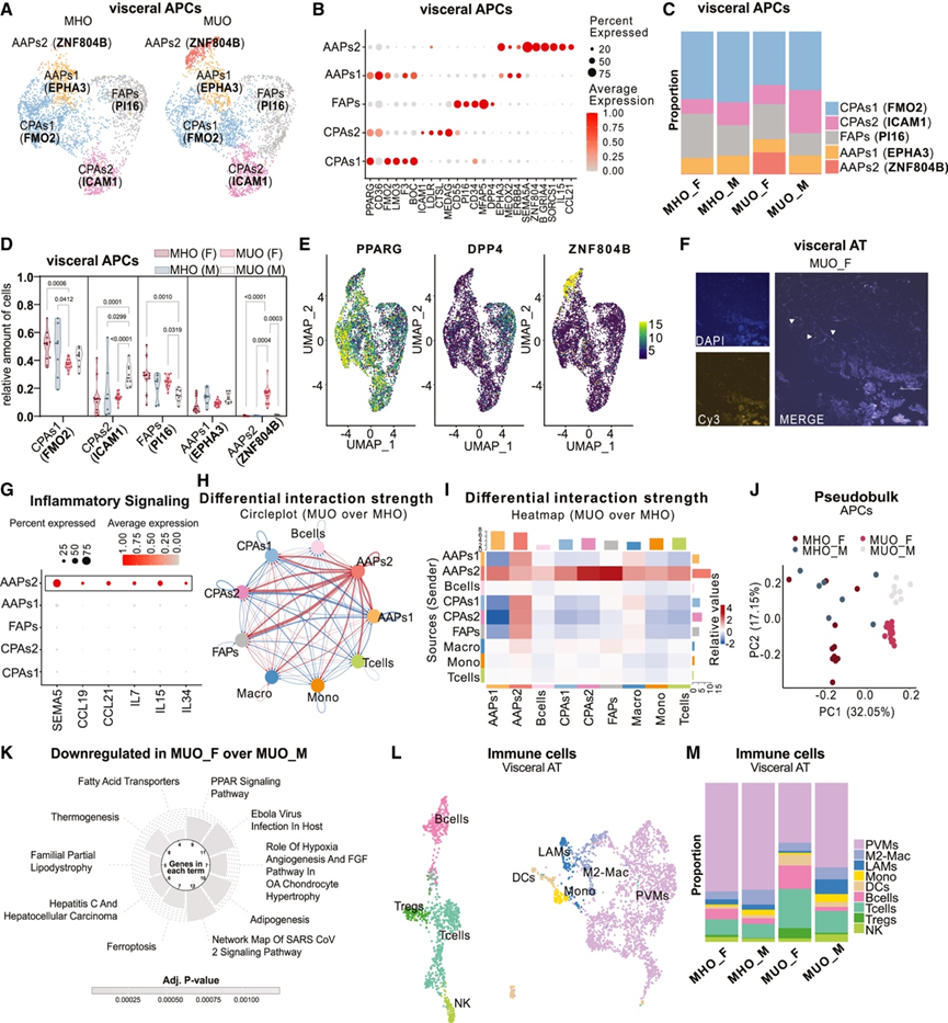 (A) 6233 个细胞核的 UMAP 代表按 MHO 和 MUO 分裂的个体内脏 APC。(B) 点图显示用于注释内脏 APC 亚群的标记基因的表达。(C) 条形图显示 MHO 和 MUO 中内脏 APC 的相对比例。(D) 小提琴图显示 SNP 分离个体中 MHO 和 MUO 的相对内脏 APC 亚型比例。(E) 特征图显示内脏 APC 中PPARG、DPP4和ZNF804B的表达。(F) 基于 RNA-scope 的染色显示MUO 女性内脏 AT 中 ZNF804B 探针的原位杂交。(G) 点图显示内脏 APC 中的细胞因子表达。(H-I) 圆形图和热图显示指示亚群的细胞间相互作用的预测差异强度。(J) PCA 显示 MHO 和 MUO 之间内脏 APC 的聚类形成。(K) 与男性相比,MUO 女性内脏 APC 中显著下调的通路。(L) 3710 个细胞核的 UMAP 代表按 MHO 和 MUO 着色的个体内脏免疫细胞。(M) 条形图显示 MHO 和 MUO 中内脏免疫细胞亚群的相对比例。