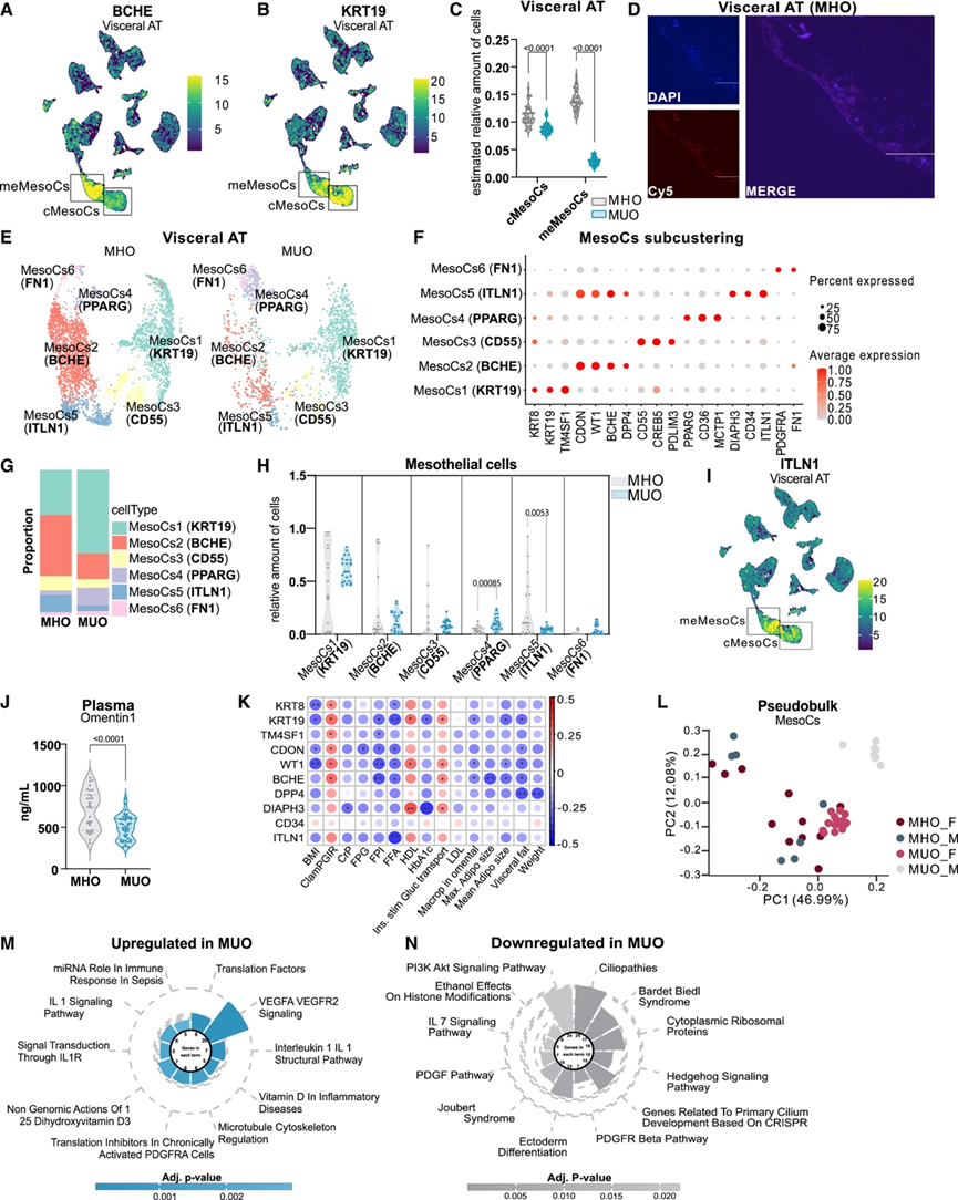 (A-B) 特征图显示内脏 AT 中BC H E和KRT19的表达。(C) 经典间皮细胞 (cMesoCs) 和间充质间皮细胞 (meMesoCs) 的相对比例。(D) RNA-scope 染色显示患有 MHO 的女性内脏 AT 中存在 BCHE 阳性细胞。(E)UMAP可视化。(F) 点图显示用于注释内脏 AT 中间皮亚群的标记基因的表达。(G) 条形图显示 MHO 和 MUO 中内脏 MesoCs 亚群的相对比例。(H) 小提琴图显示内脏 AT 中具有 MHO 和 MUO 的相对 MesoCs 亚型比例。(I) 特征图显示内脏 AT 中ITLN1的表达。(J) MHO和 MUO患者血浆 Ometin1 水平分布。(K) Spearman 相关图显示RNA-seq 数据和所示临床参数中 MesoCs1、MesoCs2 和 MesoCs5 标记基因表达呈正相关和负相关。(L) PCA 显示 MHO 和 MUO 之间内脏 MesoC 的聚类形成。(M-N) 在 MUO 与 MHO 患者的内脏 MesoCs 中,最显著的上调和下调的通路。
