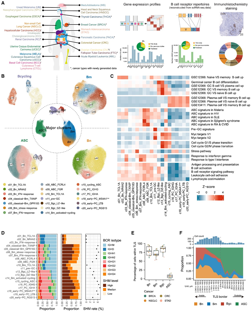 图1. 泛癌B细胞单细胞谱。