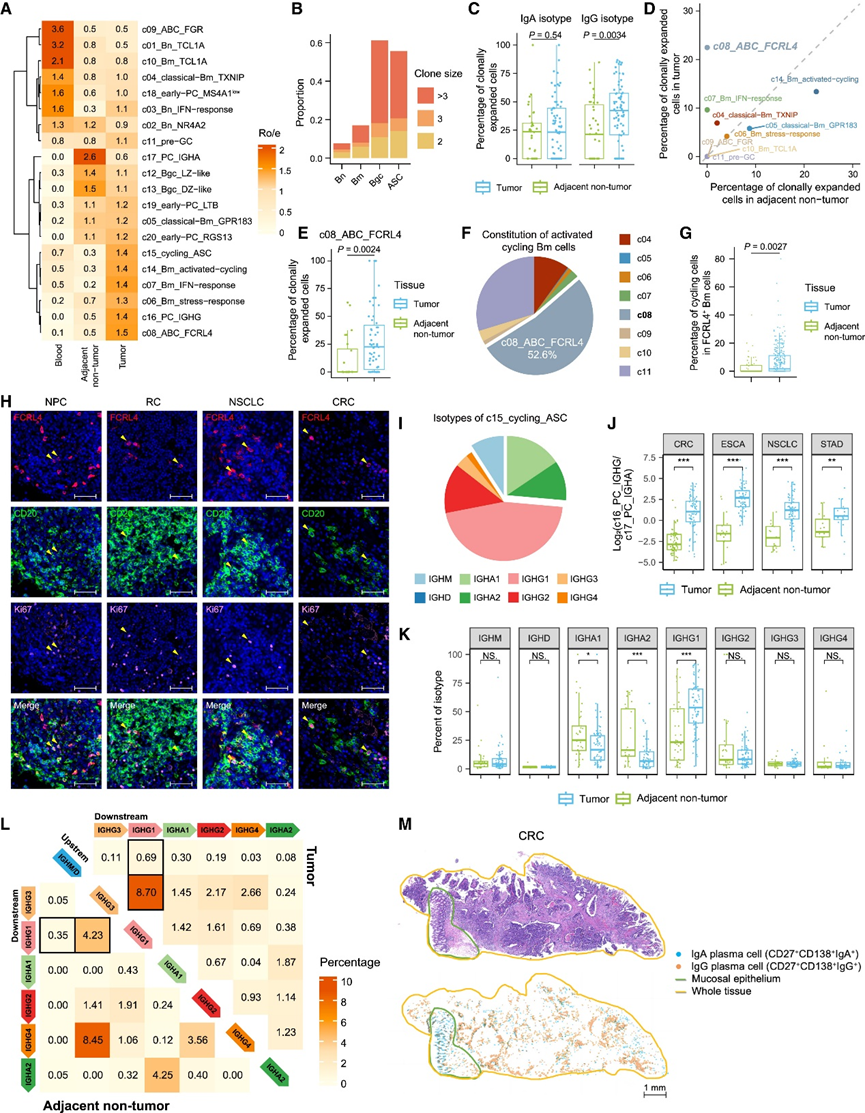 (a) 通过 Ro/e 指数评估每个 B 细胞亚群的组织偏好。 (b) 肿瘤中 B 细胞主要谱系的克隆扩增水平,细胞根据其相应克隆的克隆大小进行分类。 (c) 箱线图比较肿瘤和 ANT 之间 IgA 和 IgG 同型 ASC 中克隆扩增细胞(定义为克隆大小 > 1 的克隆型细胞)的百分比。(d) 散点图显示肿瘤和 ANT 中每个 Bm 亚群中克隆扩增细胞的中位百分比。(e)箱线图比较肿瘤和 ANT 之间 c08_ABC_FCRL4 细胞中克隆扩增细胞的百分比。(f) CellTypist 分配的子集特征在激活的循环 Bm 细胞中的分布。 (g) 箱线图比较肿瘤和 ANT 中所有 FCRL4+ Bm 细胞中循环细胞的比例。 (h) 经 mIHC 染色的肿瘤样本代表性示例,显示存在 Ki67+ FCRL4+ B 细胞。(i) c15_cycling_ASC 中 IgH 同种型的分布。(J)箱线图比较肿瘤和 ANT 之间 c16 与 c17 PC 的丰度比。 (K) 箱线图比较肿瘤和 ANT 之间 ASC IgH 同种型的组成。(L) 肿瘤(右上)和 ANT(左下)中不同 IgH 同型的 B 细胞间 BCR 库重叠。(M) CRC 肿瘤样本的苏木精-伊红染色,显示 IgA 和 IgG PC 的空间分布。