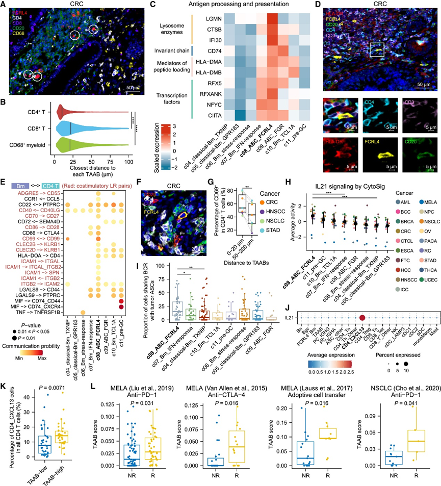 (a) 细胞空间分布分析。(b) 所有染色肿瘤中每个 TAAB 与其最近的 CD4+ T、CD8+ T 或 CD68+髓系细胞之间的距离。(c)肿瘤内 Bm 亚群中抗原加工和呈递相关基因的表达。(d) 细胞空间分布分析。(e) 肿瘤内 CD4 T 细胞与每个 Bm 亚群之间的显著配体-受体对。(f) mIHC 分析。(g) CD4+ T 细胞与 TAAB 的距离与活化 CD4+ T 细胞占总 CD4+ T 细胞的百分比之间的关系。(h) 肿瘤内每个 Bm 亚群的 IL-21 信号活性。(i) 每个 Bm 亚群中与肿瘤内 ASC 共有 BCR 的细胞比例。(J) TME 免疫亚型中的IL21表达。(K) 两组肿瘤样本中CXCL13 + CD4 T 细胞占所有 CD4 T 细胞的百分比分析。 (L) 癌症免疫疗法应答者和无应答者之间 TAAB 特征表达的比较。