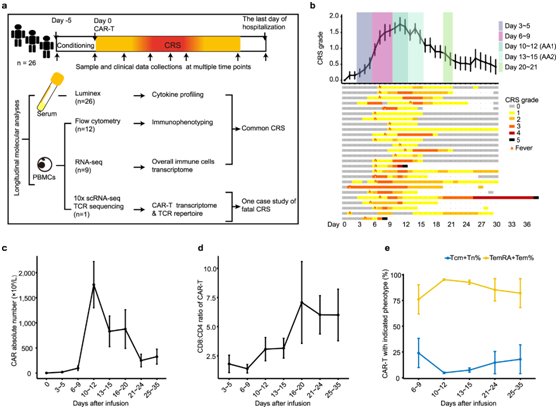 (a) 实验设计概述,包括样本和临床数据收集、细胞因子分析、CAR-T 免疫表型、转录组测序和 TCR 谱分析。 (b) 图表(上)显示了所有 26 名患者在 Cilta-cel 输注后几天的 CRS 等级平均值。swimmer图(下)显示了输注后一个月内每位患者 CRS 严重程度的动力学。 (c)外周血中Cilta-cel的增殖。(d) 该图表显示了 CAR-T 的 CD8:CD4 比率。(e) 图表显示了外周血中 CAR-T 的免疫表型特征。