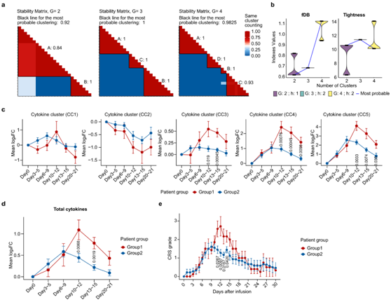 (a) 参数G的稳定性矩阵。(b) 针对每次运行和不同数量的聚类 G 计算的 fDB(函数 Davies-Bouldin)小提琴图(左)。每次运行和不同数量的聚类 G 计算的总紧密度 (T) 的小提琴图(右)。(c-d)不同观察时间各聚类中细胞因子的平均 log2FC 变化与总细胞因子之间的动态变化。(e)该图显示了Cilta-cel输注后两组CRS分级的动态变化。