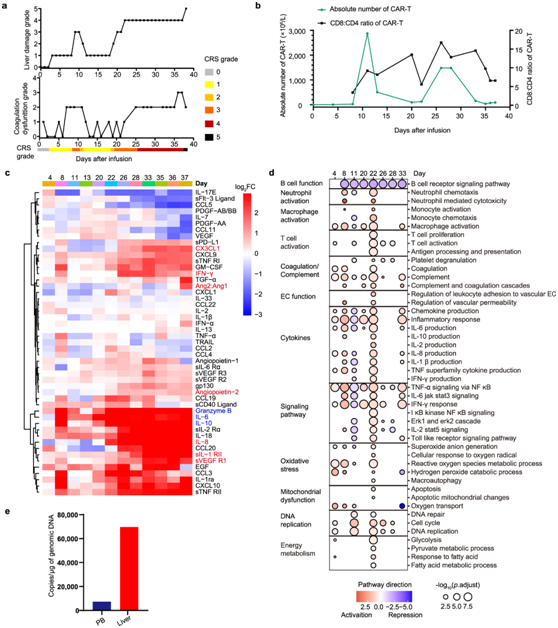 (a) 在 RJ-31 的双 CRS 过程中,根据肝损伤和凝血功能障碍对不良事件 (AE) 进行分级。 (b) RJ-31 中循环 Cilta-cel 的动力学。(c) 细胞因子概况如相对于基线的细胞因子水平的log 2 FC所示。 (d) 在指定时间段进行 RNA 测序的 GSEA。(e) 第 38 天通过 qPCR 检测肝脏和外周血 (PB) 中外源转基因的 DNA 拷贝数。