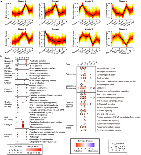 为了更好地了解免疫细胞激活级联的时间,他们进行了基因集富集分析(GSEA),将每个时间点与基线进行比较。有趣的是,中性粒细胞早在第3~5天(潜伏期)反应最强,而巨噬细胞和T细胞的免疫反应从潜伏期开始,并在第6~9天的发热期变得强烈(图4c),表明中性粒细胞在启动炎症反应中起着突出的先锋作用,而巨噬细胞和T淋巴细胞更多地参与随后的细胞因子级联反应的中心。随着免疫细胞的应答,关键的炎症信号通路TNF、IL-6/JAK- stat3、JAK/STAT、IL-2/STAT5和补体/凝血级联反应相应显著上调(图4c)。