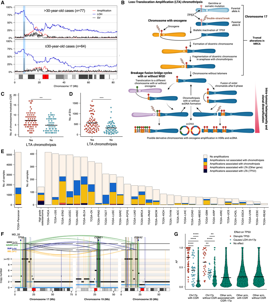 (A) 分析 17 号染色体上出现扩增(红色)、杂合性缺失 (LOH)(蓝色)和 SV(黑色)的儿童和成人骨肉瘤比例。(B) 导致TP53缺失的事件和在高级别骨肉瘤中观察到的致癌基因扩增的示意图。(C) 高级别骨肉瘤中 CGR 所涉及的染色体数量,根据TP53基因座断点触发的 17p 染色体上 CGR 的存在进行分层。(D) 根据TP53基因座断点触发的 17p 染色体上 CGR 的存在情况,对高级别骨肉瘤中整个基因组中检测到的 SV 数量进行分层。(E) 涵盖 31 种癌症类型的 5239 个 TCGA 肿瘤的致癌基因扩增和 LTA 染色体碎裂事件的发生率。(F) 骨肉瘤的代表性重排谱,其中双链断裂导致TP53失活,从而通过 LTA 染色体碎裂导致多个致癌基因扩增。(G) 检测到的映射到 CGR 的重排的等位基因分数 (AF) 。