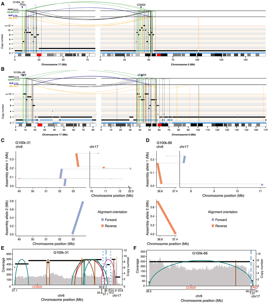 (A-D) 使用来自高级别骨肉瘤 G100-31和 G100-66 的 Illumina WGS 数据重建的 LTA 染色体碎裂事件中 6 号和 17 号染色体的体细胞 SV 和体细胞拷贝数谱。使用纳米孔全基因组测序数据对 G100-31和 G100-66中检测到的 LTA 染色体碎裂事件进行单倍型解析组装。(E-F) 使用 CoRAL 重建G100-31和 G100-66 中CCND3扩增子的结构。