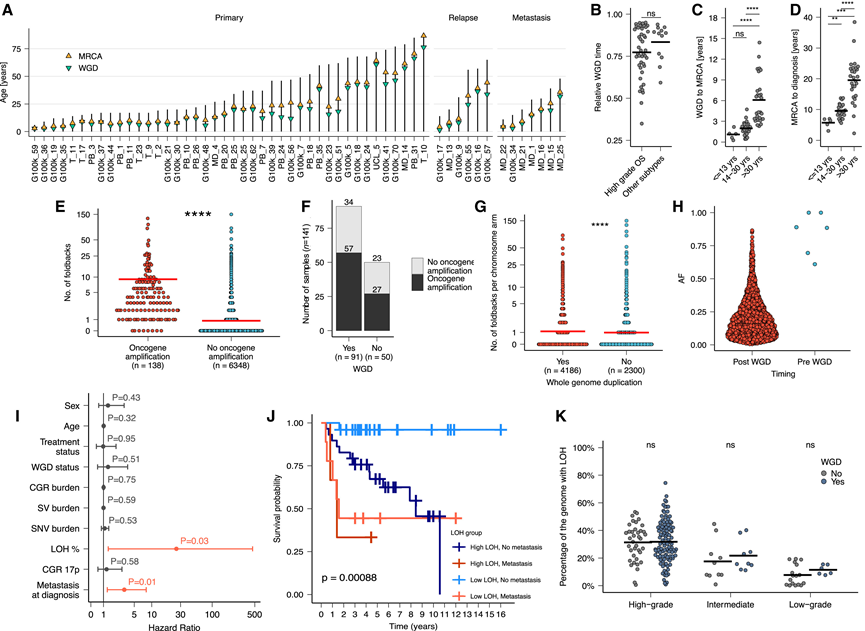 (A) 儿童和成人高级别骨肉瘤进化过程中最近共同祖先 (MRCA) 和 WGD 出现的时间估计。(B) 高级别骨肉瘤和其他亚型(骨旁、骨外、骨膜和低级别中心)的 WGD 事件的相对时间估计。(C) 儿童和成人骨肉瘤中 WGD 与 MRCA 出现之间的年数。(D) 儿童和成人骨肉瘤 MRCA 出现与诊断之间的年数。(E) 根据同一染色体臂中是否存在致癌基因扩增事件进行分层的每个染色体臂的折返倒位次数。(F) 根据 WGD 状态分层的显示致癌基因扩增的 HGOS 肿瘤部分。(G) 根据 WGD 状态分层的 HGOS 肿瘤中每个染色体臂的折回倒位数量。(H) 折返反转的 AF 根据其估计发生在全地大爆发之前还是之后进行分层。(I) 多变量生存分析。(J) 全基因组杂合性缺失 (LOH) 可预测 HGOS 患者的总体生存率。(K) G100k 和 TARGET 队列中高、中、低级别骨肉瘤中显示 LOH 的基因组百分比,根据 WGD 的存在进行分层。