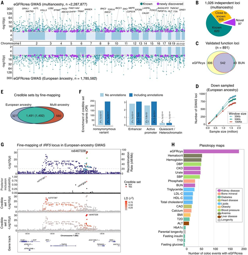 (A) 2287877 名多血统个体和 1785582 名欧洲血统个体的 eGFRcrea GWAS 的曼哈顿图。(B) 在多血统 GWAS 中确定的已知和新的独立基因座的比例。(C) 至少有一个经 eGFRcys 和 BUN 验证的变异的独立基因座的数量。(D) 在欧洲血统的下采样 GWAS 中识别的 GWAS 基因座数量。(E) 通过在 2287877 名多血统个体和 1785582 名欧洲血统个体的 eGFRcrea GWAS 中精细映射可信集的重叠。(F) 非同义变体、肾脏增强子和活性启动子中可信集变体的富集。(G) 通过在欧洲血统 GWAS 中的IRF5基因座中精细映射可信集的基因座。(H) eGFRcrea 和其他性状的多效性图。