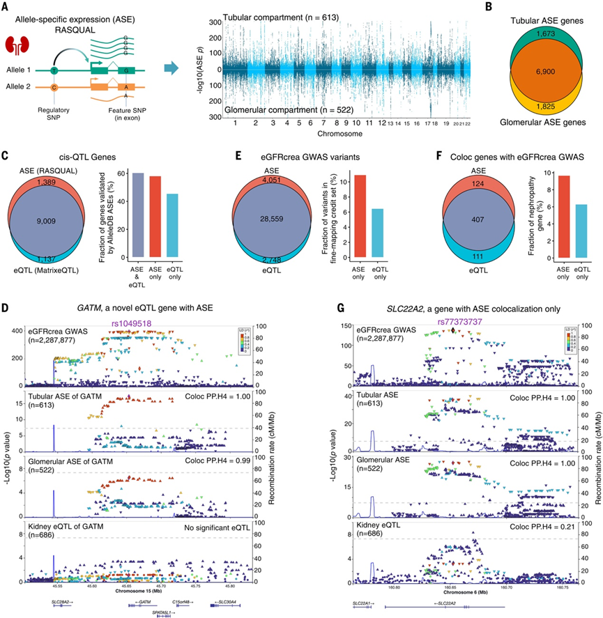 (A) 肾小管和肾小球区室中 ASE 分析的分析方案和曼哈顿图。(B) 使用 RASQUAL 在肾小管和肾小球区室中鉴定的 ASE 基因的重叠。(C) 同一数据集中 RASQUAL 鉴定的 ASE 基因数量和 MatrixeQTL 鉴定的 eQTL 基因数量(左)以及 AlleleDB ASE 验证的基因分数(右)。(D) GATM基因座中 eGFRcrea GWAS、肾小管 ASE、肾小球 ASE 和肾脏 eQTL 的位点缩放。(E) 与 ASE 或 eQTL 相关的 eGFRcrea 相关变异的数量(左)以及精细映射可信 eGFRcrea GWAS 集中 ASE 或 eQTL 仅有的变异的比例(右)。(F) ASE 或 eQTL 与 eGFRcrea GWAS 共定位的基因数量(左)以及报告为肾病基因的 ASE 或 eQTL 仅有的基因的比例(右)。(G) SLC22A2基因座中 eGFRcrea GWAS、管状 ASE、肾小球 ASE 和肾脏 eQTL 的轨迹缩放。
