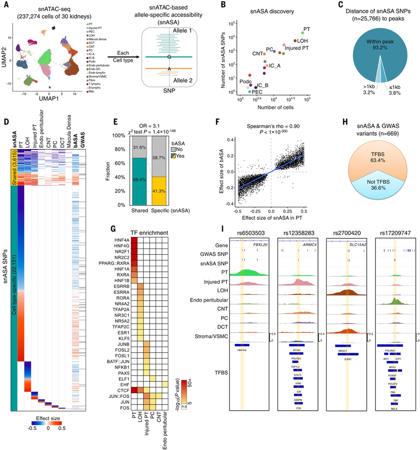 (A) 人类肾脏细胞类型中 snASA 分析的分析工作流程。(B) 每种细胞类型中鉴定出的细胞数(x轴)和 snASA SNP(y轴)。(C) 开放染色质峰内 snASA SNP 的比例。(D) 肾脏细胞类型(列)中细胞类型特异性和共有的 snASA SNP(行)。(E) 经 bASA 验证的细胞类型特异性和共享的 snASA SNP的比例。(F) PT snASA(x轴)和肾脏 bASAs(y轴)之间效应大小的关联。(G) 细胞类型特异性 snASA SNP 在 TFBS 上的富集。(H) snASA 和 GWAS 变体与 TF 结合位点重叠的比例。(I) snASA 和 GWAS 变体与细胞类型特异性的开放染色质峰和 TFBS 重叠的示例。