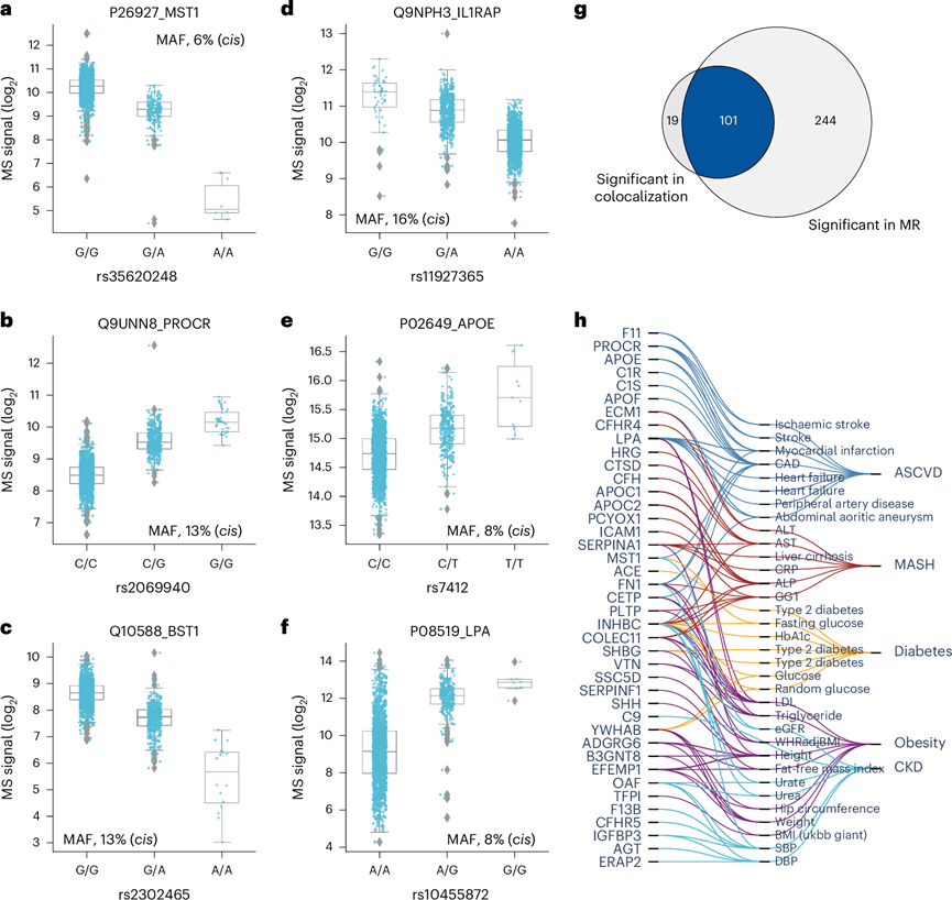 接下来,他们使用从关联检验和基于标准化之前的数据计算的等位基因倍数变化得出的 beta 统计数据来研究效应大小。MST1、PROCR、BST1、IL1RAP、APOE 和 LPA 等蛋白质的较大效应大小可能对临床和生物标志物研究具有重要意义(图5a-f)。值得注意的是,rs2232613-T 错义突变使 LBP 水平降低了四倍。鉴于这种蛋白质在先天免疫中的重要作用,他们推测具有突变形式的个体的免疫力受损,这确实已有报道。观察到的显著遗传效应强调了在解释临床和生物标志物研究结果时考虑 pQTL 信息的重要性,特别是对于受遗传变异强烈影响的蛋白质。