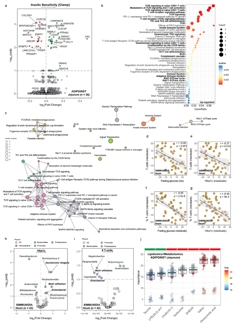 (a) 通过 limma-voom 分析确定的与 ADIPOINST 队列患者空肠胰岛素敏感性(高胰岛素-正常血糖钳)相关的差异表达基因的火山图。(b) 通过通路过度表达分析确定的与空肠胰岛素敏感性显著相关的通路点图。(c) 使用富集图将过度表达分析结果映射为通路功能网络。(d-g) 空腹血糖或糖化血红蛋白水平与 SIMMUNIDIA 队列患者回肠中 T 细胞数量或 T 细胞百分比之间的部分 Spearman 等级相关性(根据年龄、性别和 BMI 调整)的散点图。(h-i) 使用 ANCOM-BC 确定的与糖化血红蛋白相关的差异微生物属的火山图SIMMUNDIA 队列回肠中 T 细胞的数量。(j) ADIPOINST 队列空肠中与胰岛素敏感性相关的代谢物/脂质的标准化变量重要性度量的箱线图。