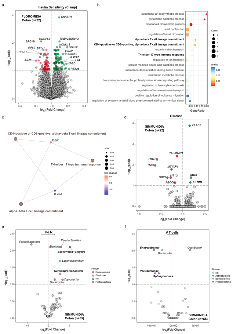 (a) 通过控制年龄、性别和 BMI 的 limma-voom 分析确定了 FLOROMIDIA 队列患者结肠中与胰岛素敏感性相关的差异表达基因的火山图。(b) GO分析。(c) 基因概念网络描绘了与参与 Th17 免疫反应和 CD4+ 或 CD8+、α-β T 细胞谱系特化的胰岛素敏感性相关的重要基因之间的联系。(d) 通过控制年龄、性别和 BMI 的 limma-voom 分析确定的与 SIMMUNIDIA 队列患者结肠空腹血糖水平相关的差异表达基因的火山图。(e-f) 使用 ANCOM-BC 确定的与 HbA1c 相关的差异微生物属的火山图和 SIMMUNDIA 队列 (n=55) 结肠中的 T 细胞数量。