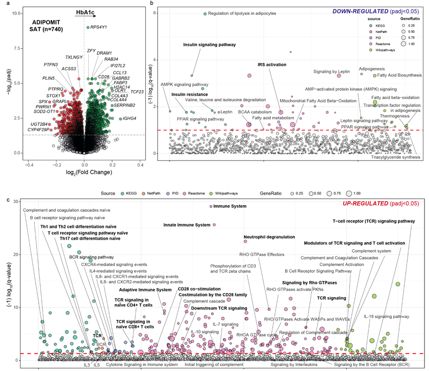 (a) SAT 中与 HbA1c 相关的差异表达基因的火山图。(b) 与空肠胰岛素敏感性显著相关的通路曼哈顿图。(c) 将显著下调的基因和显著上调的基因映射到不同数据库中。