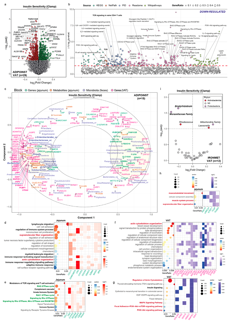 (a) 差异表达基因的火山图。(b) 通过通路过度表达分析确定的与 VAT 中的胰岛素敏感性显著相关通路。(c) 使用多块稀疏 PLS 模型整合 ADIPOINST 队列中与胰岛素敏感性相关的空肠和 VAT 基因、空肠代谢物和粪便微生物种类的相关圆图。(d-g)通路分析。(h) 与胰岛素敏感性强烈负相关的空肠基因的点图。(i) 使用 ANCOM-BC 确定的 IRONMET VAT中与胰岛素敏感性相关的差异微生物属的火山图。