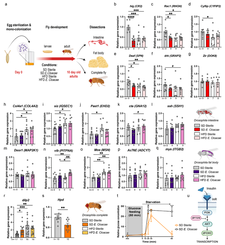 (a)实验方案。(b-s)不同基因的相对表达。(t) 在 0、10、20、30 和 90 分钟后喂食葡萄糖后幼虫血淋巴的葡萄糖清除率。(u) 果蝇中 FOXO 通过胰岛素信号激活的示意图。