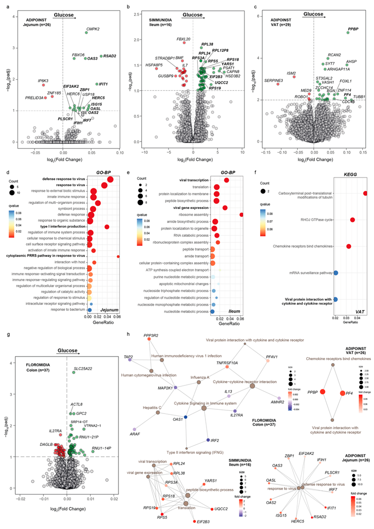 (a, b, c, g) 差异表达基因的火山图。(d-f)通路分析。(h) 基因概念网络描绘了与空腹血糖水平相关的重要基因与参与空肠、回肠、内脏脂肪组织和结肠抗病毒反应途径的联系。