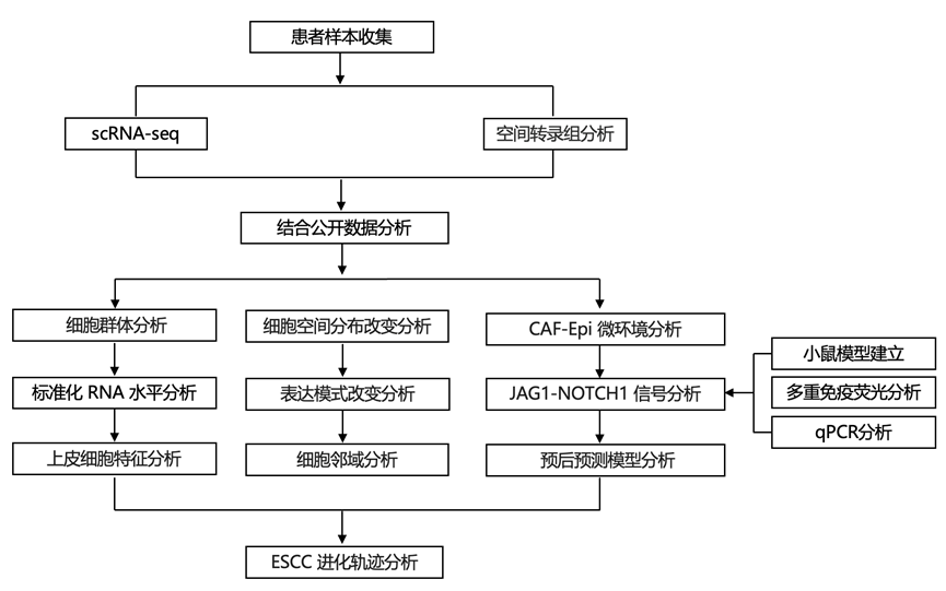 本研究展示了单细胞分辨率的空间转录组图,涵盖了来自 43 名患者的 127 个多阶段视野,以绘制人类食管鳞状细胞癌 (ESCC) 的进化轨迹。通过分析 640 万个细胞,发现 ESCC 进展是由获得去分化和侵袭性特征的增殖性上皮细胞亚群驱动的。在晚期癌前阶段,这些细胞破坏上皮-基质界面并通过 JAG1-NOTCH1 信号传导招募正常成纤维细胞,将它们转化为CAF。这种相互作用导致在肿瘤边缘形成“CAF-Epi”生态位,保护肿瘤免受免疫监视。 CAF-Epi 微环境形成是 ESCC 和其他鳞状细胞癌进展及患者预后的关键指标。