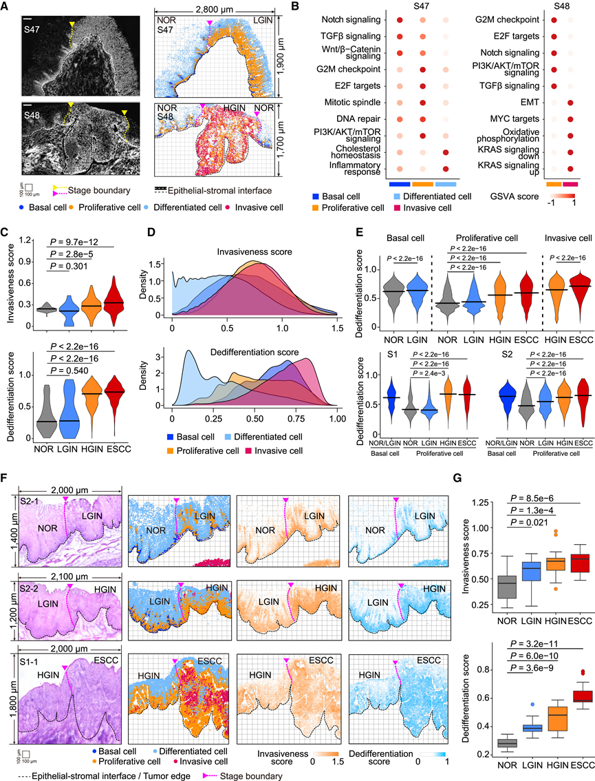 (A) 使用 TF-seqFISH 平台检查的两个组织切片(S47 和 S48)的 DAPI 图像(左) 和空间图(右)。(B) 点图显示不同上皮细胞亚群中通路的基因集富集分析 (GSVA) 的 Z 分数。(C) 小提琴图显示 scRNA- seq 数据中 NOR、LGIN、HGIN和 ESCC阶段的上皮侵袭性评分(上)和去分化 评分表达(下图)。(D) 核密度图显示Xenium In Situ数据中不同阶段不同上皮细胞亚群的上皮侵袭性评分(上)和去分化评分(下)。(E) 小提琴图显示所有患者在相应疾病阶段的基底细胞、增殖细胞和侵袭细胞的去分化评分(上)。2 名不同患者的增殖细胞和基底细胞的模式(下)。(F) 代表性上皮结构的H&E 染色图像(左)和空间图(右)。(G) 箱线图显示NOR、LGIN、HGIN和 ESCC阶段的上皮侵袭性(上)和去分化评分(下)。