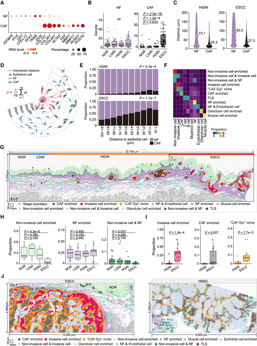 (A) 点图显示 NF 和 CAF 中标记基因的标准化 RNA 水平。(B) 箱线图显示不同阶段每个 FOV 中的 NF 和 CAF 的平均密度。(C) 小提琴图显示 HGIN 和 ESCC 阶段 NF 或 CAF 到上皮细胞的距离。(D) 图表显示成纤维细胞和上皮细胞的空间接近度的定量。(E) 堆积条形图显示在 HGIN(16 FOV)和 ESCC(16 FOV)阶段按距离组在空间区域内识别的 NF 和 CAF 的比例。(F) 热图显示 11 个细胞邻域聚类中 10 种细胞类型的比例。(G) 代表性载玻片(S1-2)中11种细胞邻域分布的空间图。(H-I) 箱线图显示不同阶段每个 FOV 中每个细胞邻域聚类的比例。(J) ESCC和HNSC中代表性CAF-Epi微环境的空间图。