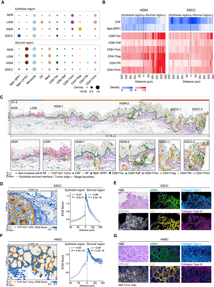 (A) 点图显示不同阶段每个 FOV 中上皮(上)和基质(下)区域中免疫细胞亚型的平均密度。(B) 热图显示距离上皮-基质界面 (HGIN) 或肿瘤边缘 (ESCC) 不同距离的 CAF和SPP1+ 巨噬细胞(上)CD8+和 CD4 + T 细胞(下)的平均密度。(C) CAF-Epi 生态位和不同类型免疫细胞的代表性分布的空间图。(D, F) ESCC和HNSC样本中 ECM 评分与肿瘤边缘距离的相关性分析。(E, G) ESCC和 HNSC样本中 EPCAM、CAF 活化标志物 αSMA 和 FAP 以及 ECM 成分 I 型胶原蛋白和 III 型胶原蛋白的 H&E 染色和多重免疫荧光图像。