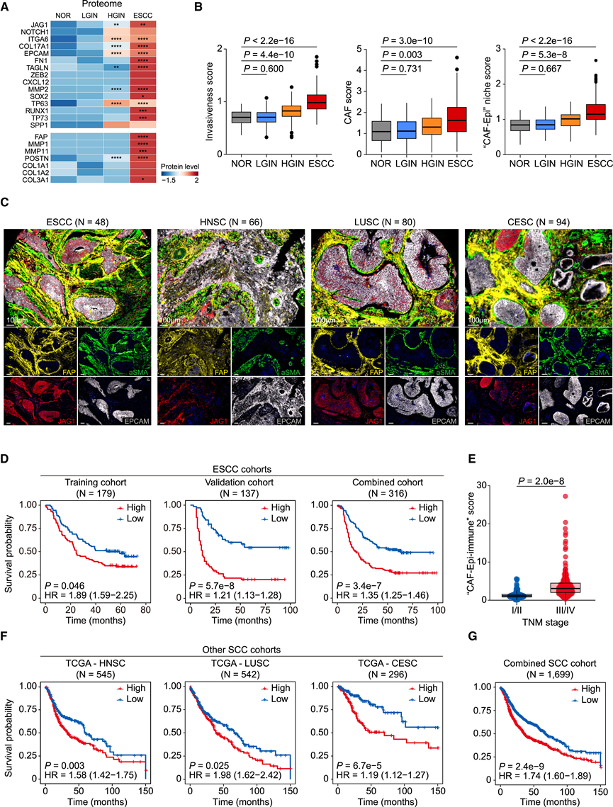 (A-B) 热图显示与侵袭性细胞和 CAF相关的基因的蛋白质表达水平,箱线图显示生态位评分。(C) ESCC、HNSC、LUSC 和 CESC 样本中 CAF(FAP 和 αSMA)和侵袭性上皮细胞(JAG1 和 EPCAM)标志基因的多重免疫荧光。(D) Kaplan-Meier 曲线。(E) ESCC 联合队列中 ESCC 患者的风险评分按 TNM 分期分层。(F-G) Kaplan-Meier 曲线显示 TCGA 数据库中 SCC 患者的总体生存率。