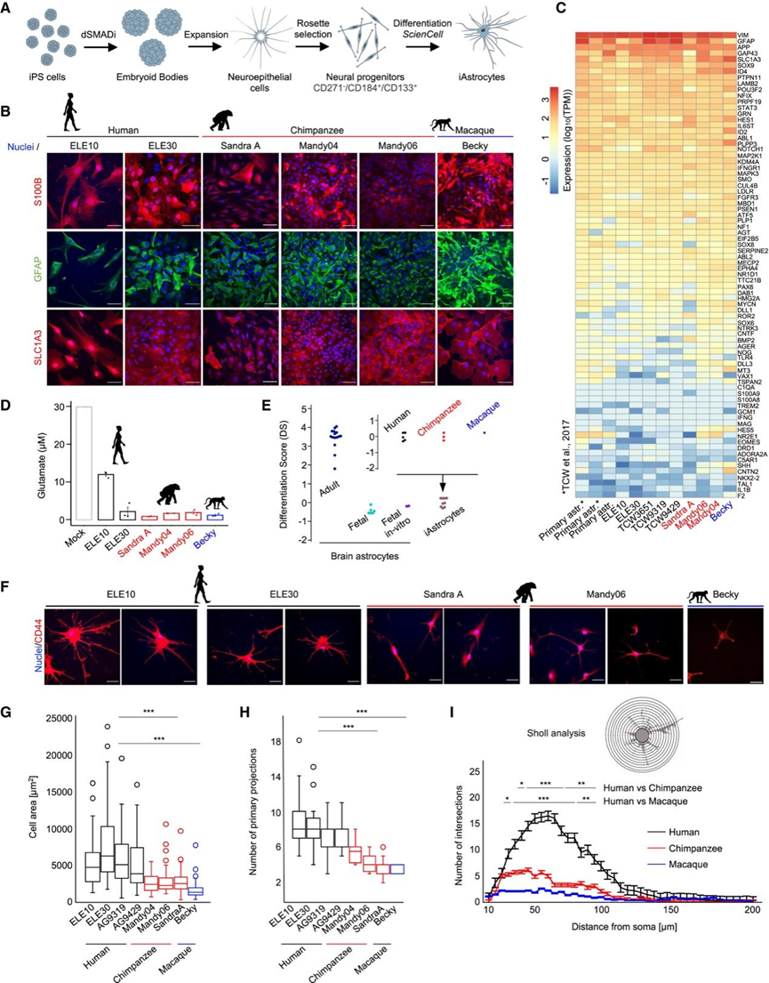 (A)实验设计。(B) 表达 S100B(红色)、GFAP(绿色)、SLC1A3(红色)的 iAstrocytes 代表性免疫荧光图像。(C) 体外培养的人胎儿脑衍生星形胶质细胞和 iAstrocytes 中的星形胶质细胞标志物的 RNA-seq(TPM,每百万转录本)表达水平热图。(D) 体外培养的人胎儿脑衍生星形胶质细胞和 iAstrocytes 中的星形胶质细胞标志物的 RNA-seq(TPM,每百万转录本)表达水平热图。(E) 显示不同细胞系和物种的细胞成熟程度相似。(F) 人类 iAstrocytes 的形态比 NHP 同类细胞更复杂。(G) 来自不同供体的 iAstrocytes 的总细胞面积。(H) 来自不同供体的 iAstrocytes 的总细胞面积。(I) iAstrocytes 的 Sholl 分析。