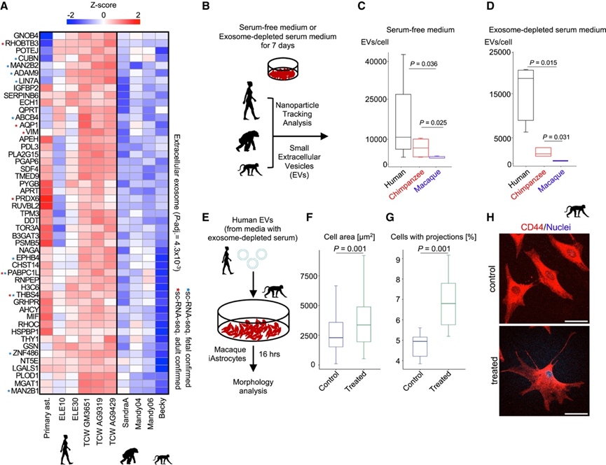 ExEg 类别中的基因包括与外泌体生物学有关的基因座——外泌体是影响神经系统稳态和病理的细胞外囊泡 (EV)。为了确定三种灵长类动物的 iAstrocyte 之间的外泌体分泌是否存在差异,他们从 iAstrocyte 培养基中分离出分泌的颗粒,并使用纳米粒子跟踪分析( NTA) 对其进行了表征。这些颗粒对外脂膜 (CellMask) 和四跨膜蛋白(CD63、CD9、CD81)呈阳性,证实了它们的身份。人类 iAstrocyte 比 NHP iAstrocyte 产生的 EV 多(图3B-D)。因此,人类星形胶质细胞的进化表现为 EV 产量的增强。