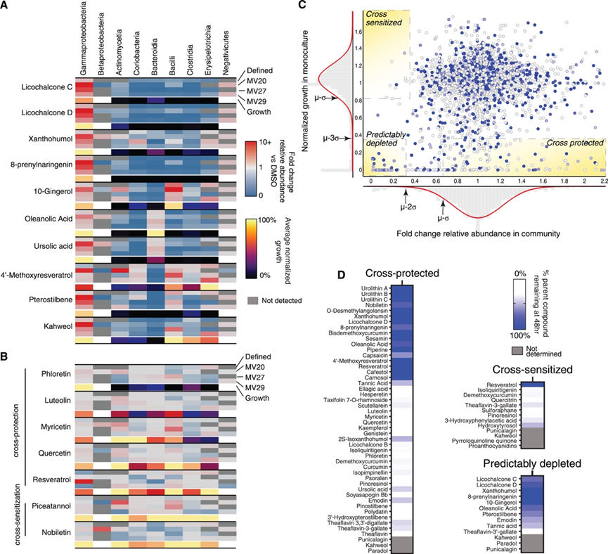 接下来,他们评估了群落中单个分类群对每种饮食外来生物的相对丰度变化。某些化合物(包括泛破坏性化合物)改变了群落中同一细菌类别的相对丰度(图 3A)。此外,这些化合物引起的群落组成变化与检测到的对单个物种的毒性一致:抗性类群(例如,Gammaproteobacteria)的相对丰度增加,而易感类群则减少。然而,对于大多数膳食外来化合物而言,四个群落之间的分类群相对丰度变化并不相同,也无法根据化合物对单一栽培中相关分类群的毒性进行预测(图3B)。此外,许多化合物只引起整体成分的细微变化,但仍导致多个类群的相对丰度发生显著变化。为了更仔细地分析单个物种对饮食中外来化合物的敏感性与其在群落中的相对丰度之间的关系,他们绘制了在单一栽培中用给定化合物处理的特定菌株的生长情况与用相同化合物处理的38个成员定义群落中相同菌株的相对丰度(图 3C)。在此图中,大多数点都落在每个轴上的正态分布内,因为大多数化合物在单一培养中无毒,也不会对群落组成产生影响。一些在单一培养中有毒的化合物会导致易感类群可预测的枯竭。落在这些预期区域之外的点代表了新出现的相互作用:当一种化合物降低了群落中某个物种的相对丰度,但在单一培养中对该物种几乎没有或根本没有活性时,就会发生交叉敏感化;而当一种化合物在单一培养中对某个物种表现出显著的毒性,但不会降低群落环境中该物种的相对丰度时,就会发生交叉保护。