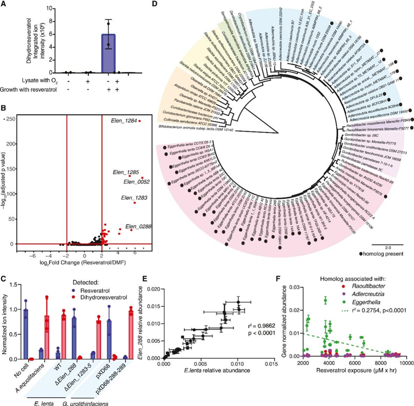 (A) 检测E. lenta产生的无细胞裂解物将白藜芦醇还原为二氢白藜芦醇的能力。(B) 火山图显示E. lenta的差异转录本丰度。(C) 通过体外培养和 LC-MS检测各种物种或菌株将白藜芦醇代谢为二氢白藜芦醇的能力。(D)系统发育树分析。(E) Elen_288的丰度和E. lenta的丰度之间的相关性。(F) 不同属的白藜芦醇还原酶同源物的丰度与白藜芦醇代谢速率之间的相关性。