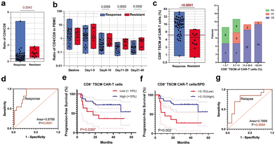 (a)根据应答状态分析患者体内CAR-T细胞产品的CD4/CD8比值。 (b) 在指定时间测量所有患者血液中CD4+和CD8+CAR-T 细胞的比率。 (c) 通过反应状态(左)和56例可评估患者反应的四分位数图(右)分析患者输注CAR-T细胞的CD8+ TSCM。(d) 基于 CAR-T 细胞产品中 CD8+TSCM 群体的反应预测的 ROC 曲线。(e-f) 对缓解患者的 PFS 进行 Kaplan-Meier 分析。 (g) 基于CAR-T 细胞中CD8+ TSCM 群体的复发预测的 ROC 曲线。