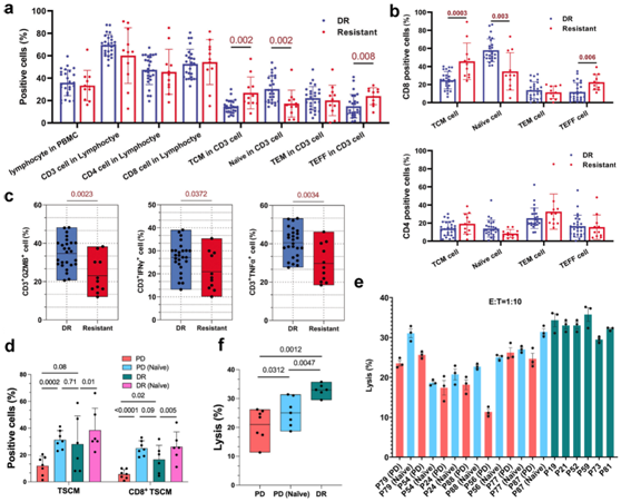 (a) DR 和耐药患者中单采 T 细胞的细胞群分析。 (b) DR及耐药患者CD8 +单采T细胞(上)和CD4 +单采T细胞(下)多项指标分析。 (c)使用 TCR 信号传导小分子模拟物刺激的单采 T 细胞中表达的 IFNγ、TNFα 和 GZMB 的直方图。(d) 不同组 CAR-T 细胞中TSCM 和 CD8 + TSCM 细胞群的百分比。(e) 输注的 CAR-T 细胞和与单采 T 细胞的幼稚 T 细胞与 Nalm6 细胞(E:T 比例为 1:10)培养的 CAR-T 细胞的细胞毒性活性。(f) 输注的 CAR-T 细胞和与幼稚 T 细胞公培养的 CAR-T 细胞的细胞毒活性的统计分析。