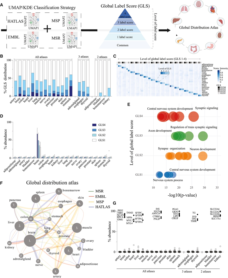 (A) 使用UMAP投影上的KDE为每个图谱(分别指HATLAS、EMBL、MSP和MSR)分配组织-蛋白质/RNA标签。(B) 条形图显示每种组织的 GLS 水平。(C) 热图描绘了组织富集蛋白质在 GLS 各个水平上的平均蛋白质丰度。(D) 各 GLS 水平的脑富集蛋白标准化强度分布。(E) 不同 GLS 水平的脑内富集蛋白质的功能富集分析。(F) 基于整体分布图谱的蛋白质-组织分配集成网络。(G)整体分布蛋白质组图谱中具有高 GLS 和组织特异性的蛋白质示例。
