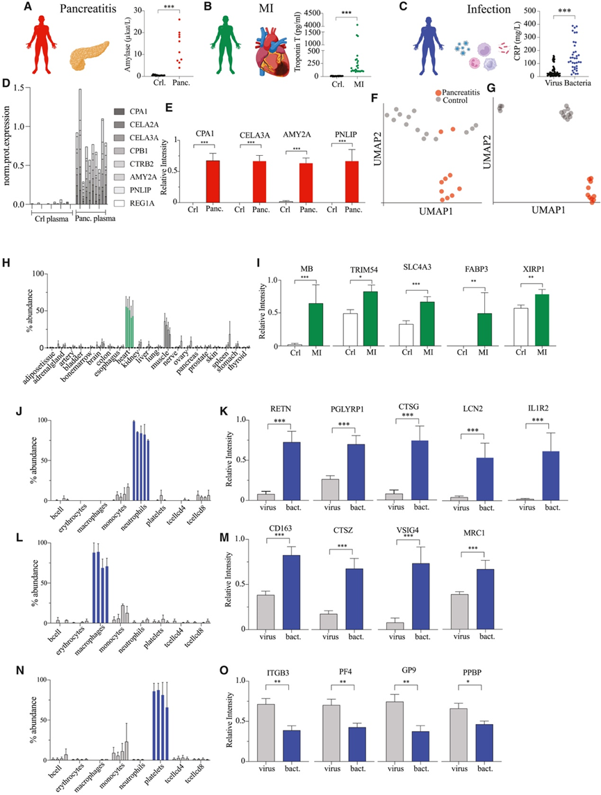 (A-C) 急诊科入选的胰腺炎、心肌梗死和感染患者队列及其相关临床生物标志物(淀粉酶、肌钙蛋白T和C反应蛋白)的概况。(D) 堆积条形图描绘了胰腺炎血浆队列(对照组与胰腺炎组)中八种胰腺富集蛋白的标准化蛋白质丰度。(E) 条形图显示了四种富含胰腺的蛋白质的丰度模式,与健康对照组相比,胰腺炎血浆中的蛋白质含量显著升高。(F-G) UMAP可视化。(H) 条形图显示不同组织中 5 种已鉴定的心脏富集蛋白质的平均丰度水平。(I) 条形图显示了 MI 血浆中三种富含心脏的蛋白质的丰度模式,与对照血浆相比,这些蛋白质在 MI 血浆中显著升高。(J-K) 条形图描绘了中性粒细胞中富集的蛋白质子集的平均丰度水平,以及细菌感染患者与病毒感染患者血浆中的平均丰度模式。(L-M) 条形图显示选定的巨噬细胞衍生蛋白的标准化平均丰度水平和它们在血浆中的丰度模式(病毒感染与细菌感染)。(N-O) 条形图显示了所有细胞类型中血小板中富集蛋白质的标准化平均丰度,以及它们在感染血浆队列(病毒感染相对于细菌感染)中的平均丰度水平。